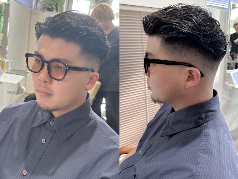オールバックフェードは清潔感と存在感を兼ね備えた人気スタイル。ビジネスシーンでは信頼感や誠実さを演出し、オフの日にはラフにスタイリングすることで色気とこなれ感を両立できます。さらに毛流れパーマを合わせることで、直毛で動きが出にくい方でも自然な立体感が生まれ、簡単に洗練された仕上がりに。